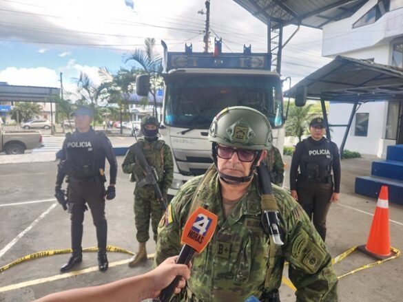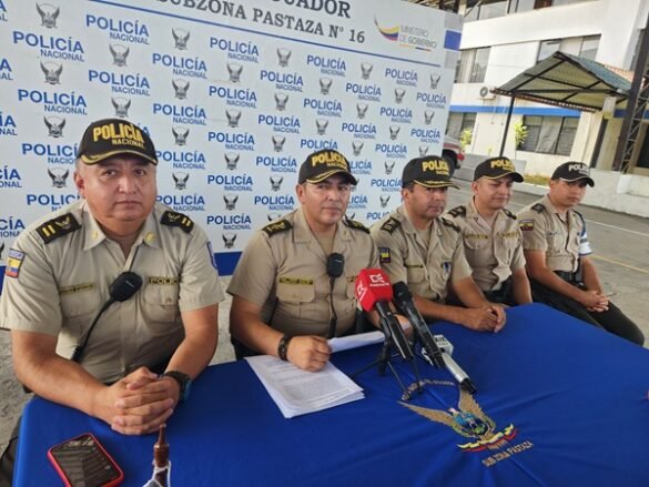 En rueda de prensa, el comandante de policía de la Subzona Pastaza CRNL. Cristian Pérez,…