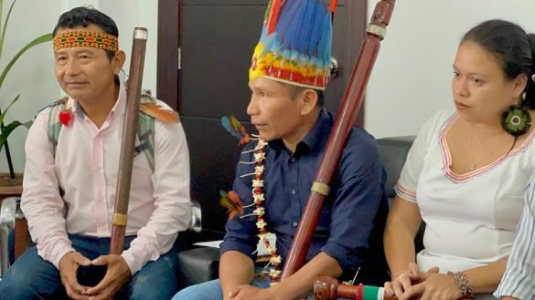 Una comisión numerosa del Consejo de Gobierno de Sarayaku, presidida por su presidente Hernán Malaver,…