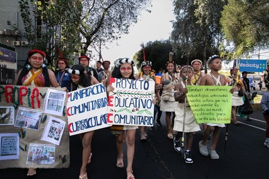 Tras una marcha y rueda de prensa, las delegaciones de las comunidades indígenas amazónicas Waorani…