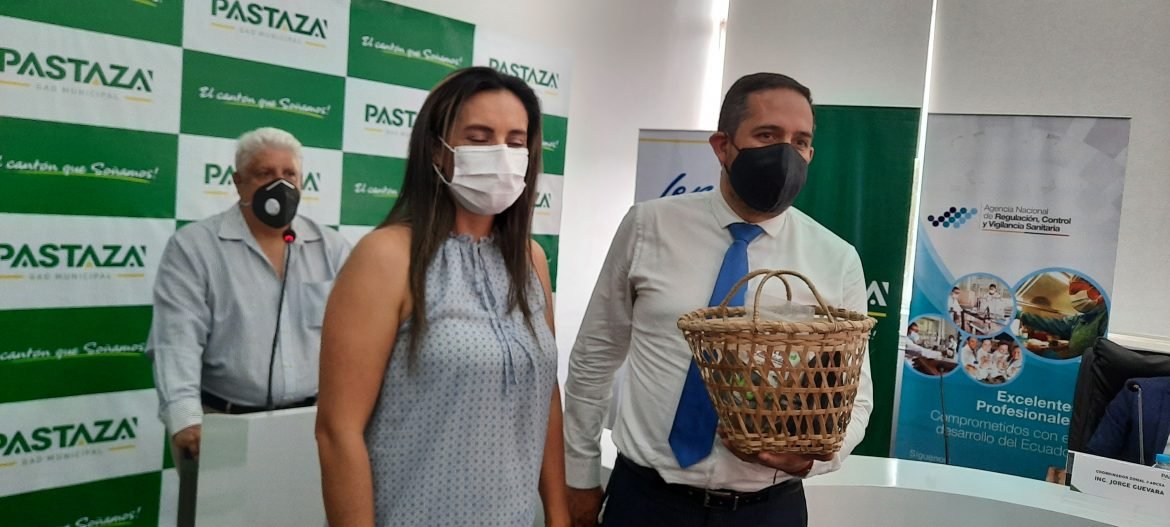 Carolina Villegas, propietaria del restaurant “La Hacienda” hace la entrega de un presente al Viceministro de Turismo, quién visitó la provincia de Pastaza junto a la Ministra Rosi Prado, para hacer le entrega del sello internacional “Safe Travels” que reconoce a Pastaza como destino turístico seguro.