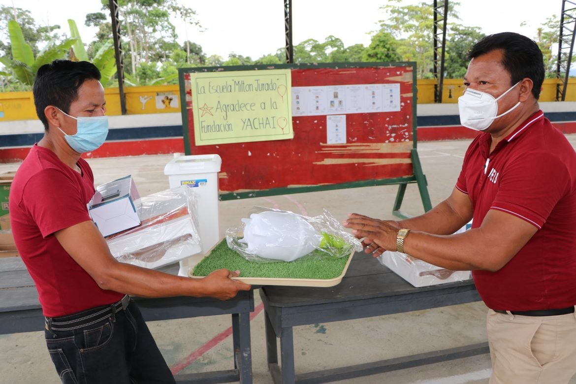 la gestión la hizo Ernesto Pizango representante en Ecuador de la Fundación Alemana Yachai, el pasado lunes 14 de diciembre se entregó los materiales e insumos de bioseguridad en la Unidad Educativa Milton Jurado del cantón Archidona, al evento de entrega acudieron maestros y varios padres de familia.