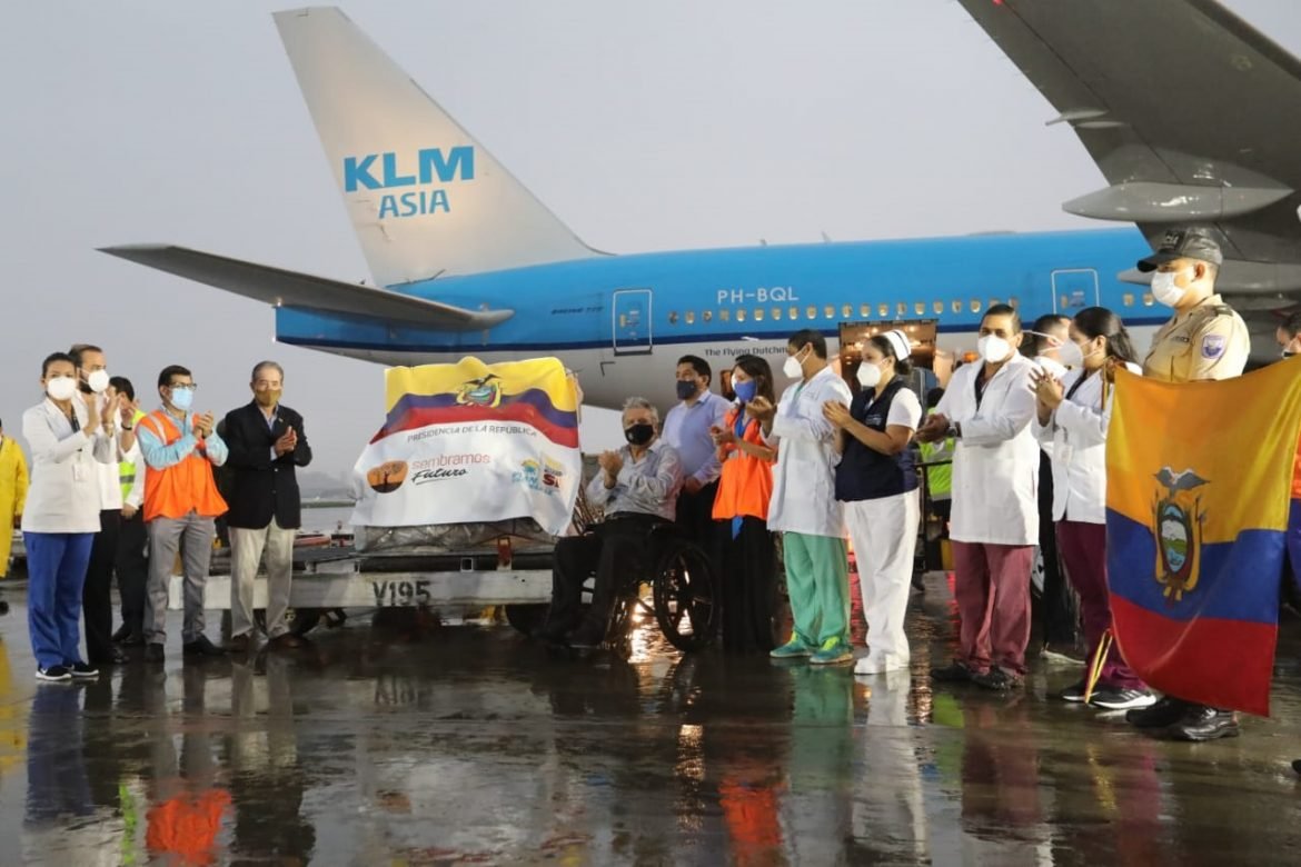 Las primeras 8.000 dosis de la vacuna desarrollada por Pfizer contra COVID-19 arribaron en un vuelo comercial de la aerolínea KLM esta tarde, 20 de enero de 2021 a Ecuador. En Quito, las dosis fueron recibidas por la vicepresidenta de la República, María Alejandra Muñoz; mientras que, en Guayaquil, minutos más tarde el jefe de Estado, Lenín Moreno, lideró la recepción de los fármacos en la pista del Aeropuerto José Joaquín de Olmedo.