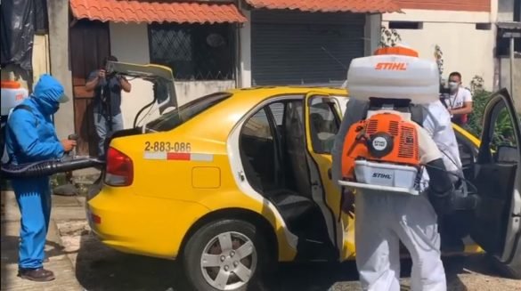 Trabajo de desinfección de las unidades de taxis y camionetas de Puyo