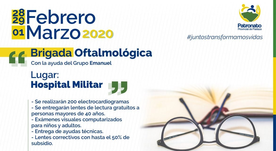 Este 28, 29 de febrero y domingo 1 de marzo de 2020, en el hospital Militar ubicado en el barrio El Dorado se efectuará la Brigada Oftalmológica organizada por el Patronato Provincial de Pastaza.