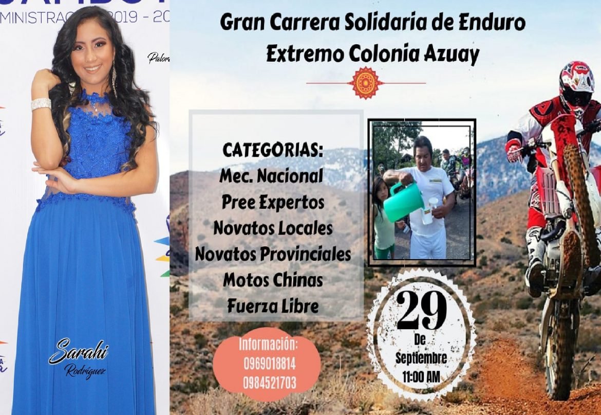 Este domingo 29 de septiembre en la colonia Azuay, a partir del mediodía, todos están invitados a la gran carrera solidaria de Enduro Extremo, que se realizará en la Colonia Azuay. La invitación es formulada por la reina de Palora, Sarahí Cashindio Rodriguez, que tendrá el apoyo de las reinas y virreinas de las parroquias.