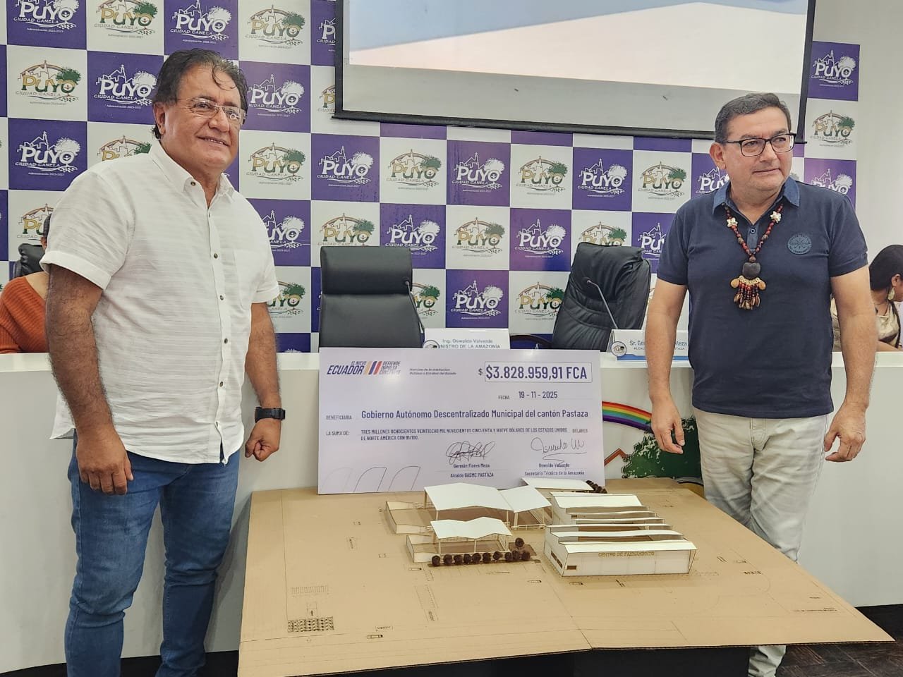 El presidente del Consejo de Planificación y Desarrollo de la Circunscripción Territorial Amazónica, Oswaldo Valverde, llegó personalmente hasta el municipio del cantón Pastaza, para hacer la entrega del cheque por un valor de 3’828.959,91 del Fondo Común Amazónico para hacer realidad la construcción de un nuevo centro de faenamiento que reemplazará al existente en el barrio El Recreo que ya ha cumplido su vida útil y además está en plena urbe, siendo una amenaza también para la contaminación del ambiente y de las aguas del río Pindo Grande.