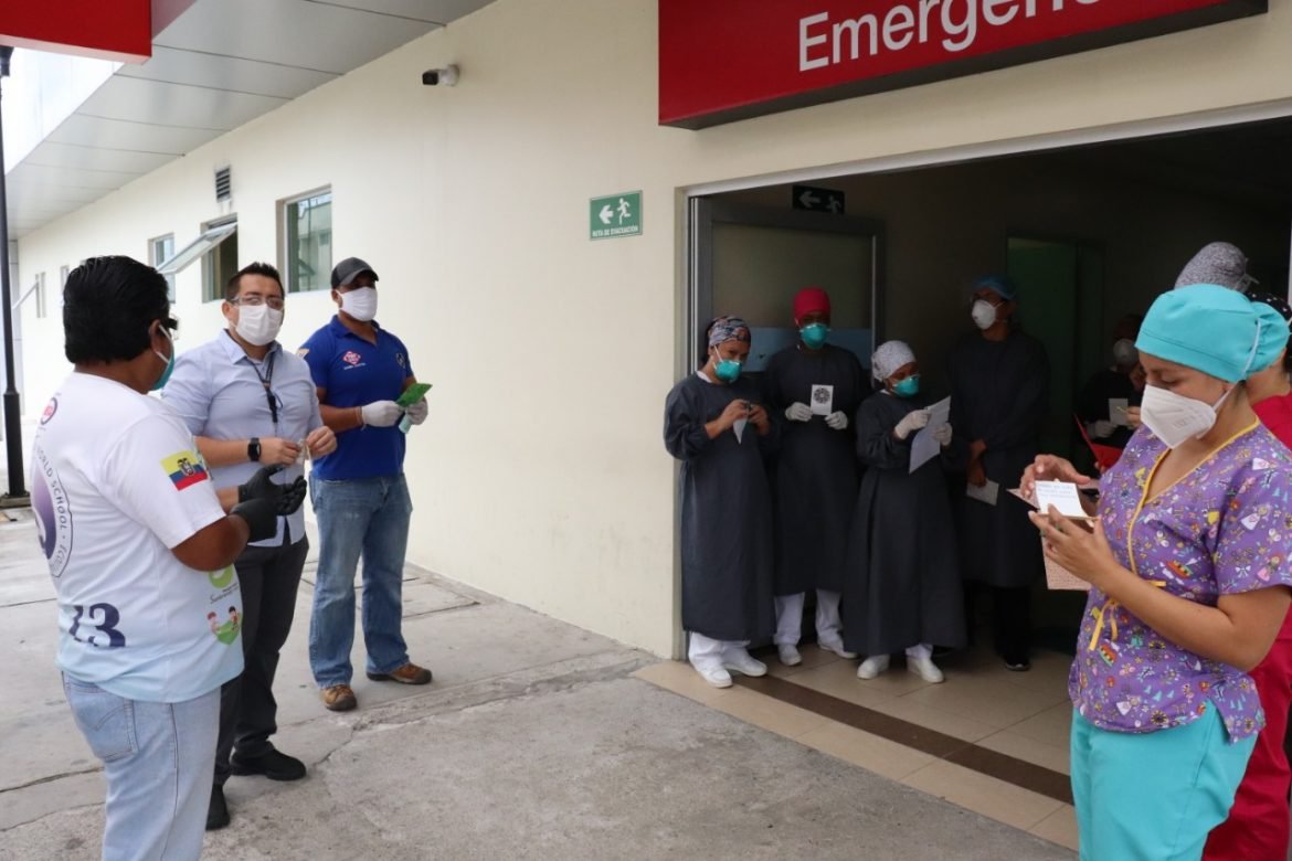 Bruno Castro es el docente que llego al hospital José María Velasco Ibarra donde fue recibido por el director de esta casa de salud, llego con una caja de cartón en cuyo interior existían varias cartas y tarjetas todas ellas con frases de aliento para los trabajadores de la salud, “Se realizo un trabajo con los jóvenes cada uno presento un detalle de corazón para quienes hoy están velando por la salud de todos” indico Castro.