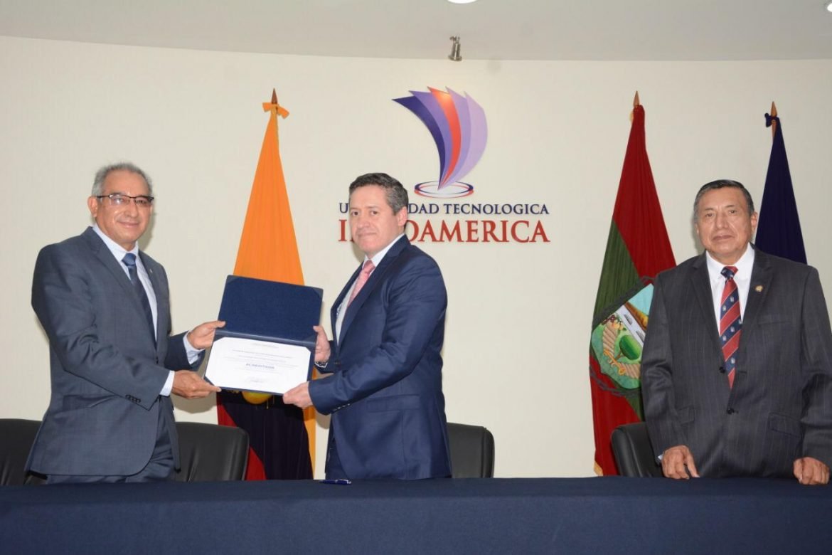 Las máximas autoridades de la Universidad Indoamérica recibieron oficialmente de manos de los funcionarios del Consejo de Aseguramiento de la Calidad de la Educación Superior (CACES), el certificado de acreditación por cinco años, lo que constituye un reconocimiento a la educación de excelencia con principios y valores humanitarios.